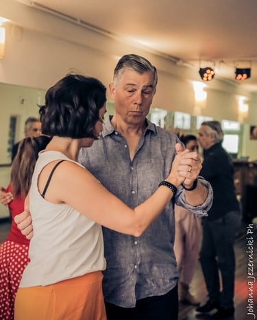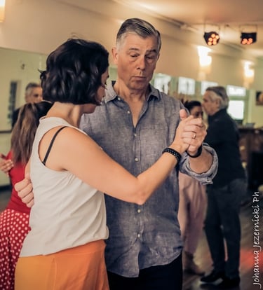 Outside of dance, she is an aspiring artist exploring watercolors, acrylics, and ceramics (and yes — centering clay is a spiritual practice!). She is married to Arne, who also dances tango, and she is the proud mother of two grown daughters — and now a grandmother to a new, amazing little girl. A future tanguera, no doubt.